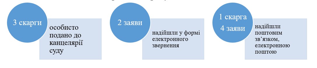 За категорією запитувачів звернення громадян надійшли від фізичних осіб, 2 звернення надійшли за належністю для розгляду в межах повноважень від ДСА України та 1 скарга отримана через Телефонну "гарячу лінію" ДСА України.